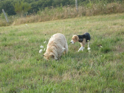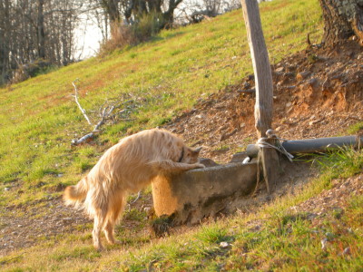 | Dit is mijn geliefde plekje. Ik overzie het landschap en houd het wild in de gaten. Dit laatste begrijpen de bazen helemaal niet. Als ik blaf komen ze niet eens kijken. Dus heb ik bedacht om voortaan gewoon extra te blaffen. |