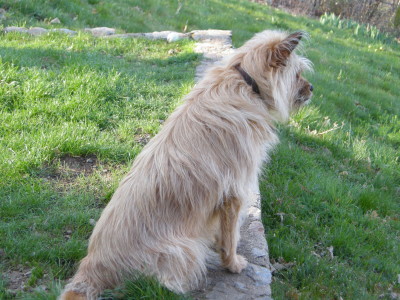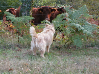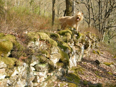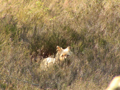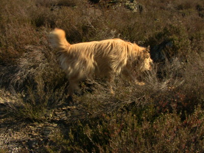 | Dit is mijn geliefde plekje. Ik overzie het landschap en houd het wild in de gaten. Dit laatste begrijpen de bazen helemaal niet. Als ik blaf komen ze niet eens kijken. Dus heb ik bedacht om voortaan gewoon extra te blaffen. |